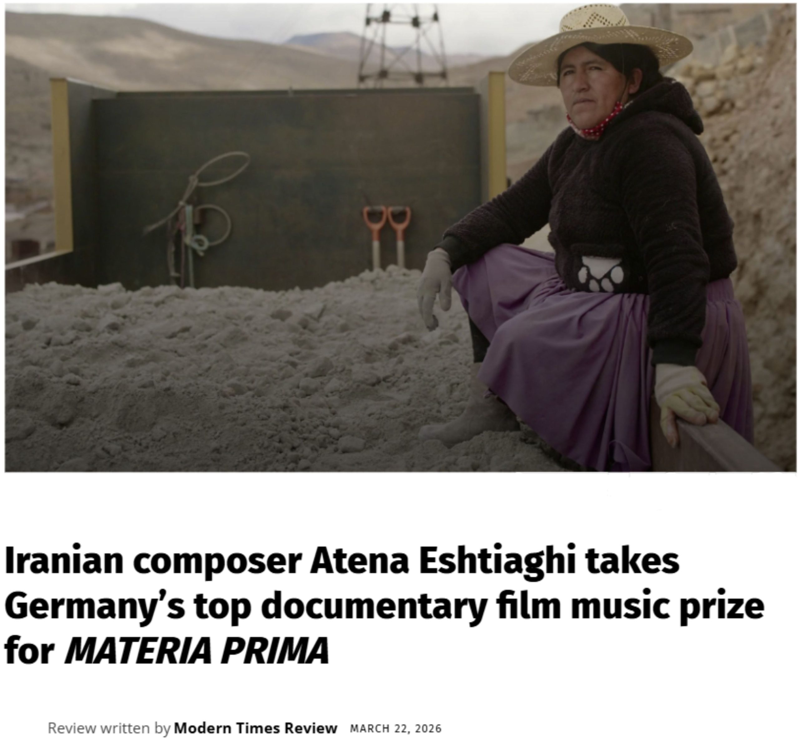 Iranian cellist and composer Atena Eshtiaghi has won the 2026 German Documentary Film Music Award for her score to MATERIA PRIMA, Jens Schanze’s documentary on lithium extraction in Bolivia that premiered at CPH:DOX. It is the second time Eshtiaghi has received the prize, after winning in 2024 for My Stolen Planet.